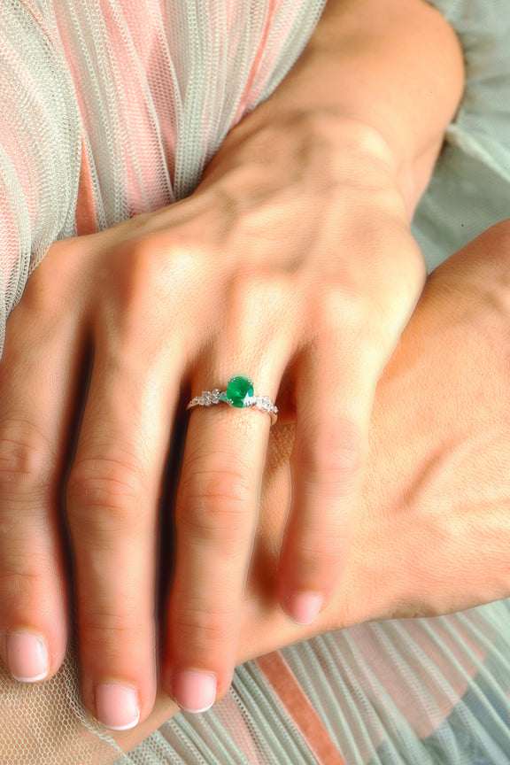 Discover the beauty of fine craftsmanship with this one-of-a-kind oval emerald and diamond ring. The centerpiece is a 0.75ct natural Colombian emerald, prized for its rich green color and exceptional clarity. It is securely set in elegant four double prongs on a delicate 1.5mm 18K solid white gold band.